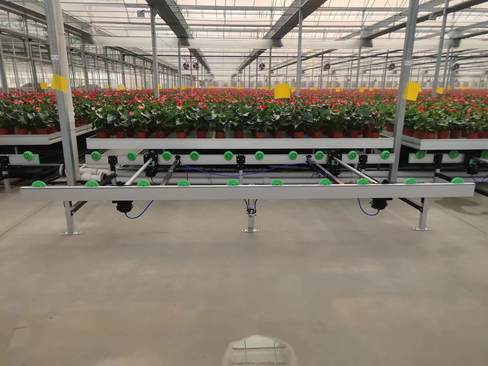 該系統(tǒng)尤其適用于數(shù)字化種苗工廠、花卉種植基地、立體化葉菜基地及高附加值作物生產(chǎn)。在數(shù)字化種苗工廠中,全自動化物流苗床系統(tǒng)能夠?qū)崿F(xiàn)種苗的規(guī);、標(biāo)準(zhǔn)化生產(chǎn),提高生產(chǎn)效率和產(chǎn)品質(zhì)量;ɑ芊N植基地利用該系統(tǒng),可以精準(zhǔn)控制花卉的生長周期和品質(zhì),滿足市場對高品質(zhì)花卉的需求。立體化葉菜基地借助系統(tǒng)的空間利用優(yōu)勢,在有限的土地上實(shí)現(xiàn)更高的產(chǎn)量。對于高附加值作物生產(chǎn),系統(tǒng)的精準(zhǔn)調(diào)控和智能管理能夠大程度地保證作物的品質(zhì)和產(chǎn)量,提高經(jīng)濟(jì)效益。